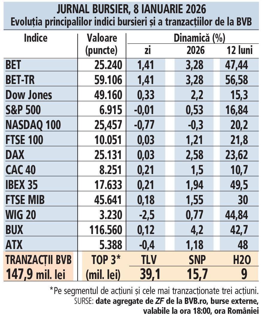 📰 ```json { "headline": "Evoluția indicilor bursieri și impactul acestora asupra BVB în 2026", "content": "Bursa de Valori București (BVB) debutează în 2026 cu creșteri semnificative ale acțiunilor, indicând o tendință optimistă pe piață. În contextul unor taxe mai mari și al unui climat economic prudent, investitorii își ajustează strategiile. Rinat Ahmetov, un nume important în sectorul energetic, își consolidează poziția în energia solară, evidențiind o diversificare a investițiilor. Pe lângă evoluțiile din sectorul agricol și real estate, Bursa continuă să joace un rol esențial în atragerea capitalului și în dezvoltarea pieței locale. Aceste dinamici subliniază importanța BVB ca platformă de investiții viabile." } ``` 🔗 https://www.zf.ro/burse-fonduri-mutuale/jurnal-bursier-8-ianuarie-2026-evolutia-principalilor-indici-23006358 Source: Ziarul Financiar